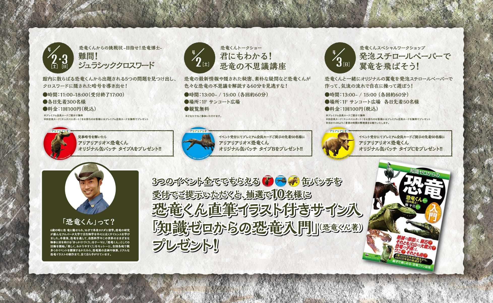 アリオ蘇我『ソガ ジュラシック・アイランド』トークショー・ワークショップ・クイズラリーの3本立てでお送りする恐竜イベントです!各開催日や詳細は下記ご確認ください。