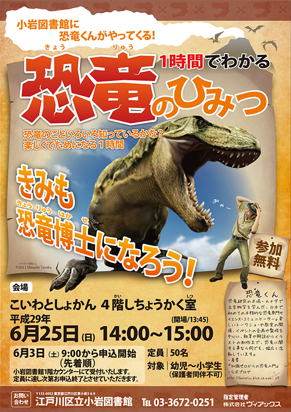 6月25日(日)、江戸川区立小岩図書館にて恐竜くんトークショー『1時間でわかる恐竜のひみつ』を実施します。江戸川区でのトークショーは2015年夏以来。皆様にお会いできるのを楽しみにしています!(※今回、募集開始と同時にすぐ満員となってしまったため、こちらでの事前告知は控えておりました。何卒ご了承ください。)
