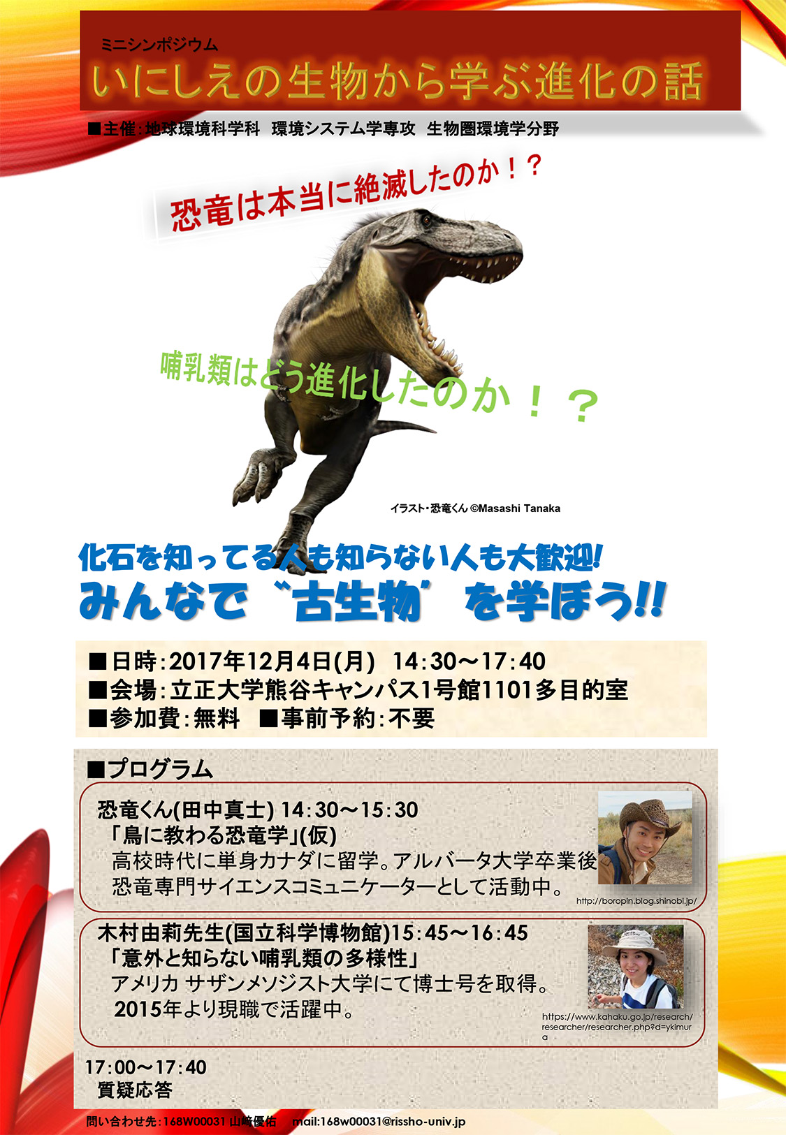 『いそご こどもエコフェスタ2017』でトークショーを実施します。今回は恐竜のお話に加えて、現在進行中の環境変動や大量絶滅がテーマです。子ども達の大好きな恐竜を通して伝えることで、日頃実感のわきにくい問題について、より深く考える機会にしたいと思います。2017年最後のイベントとなりますので、お近くの方は是非ご来場ください!
